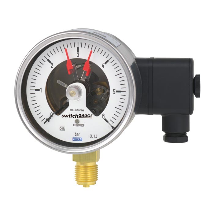 Wherever the process pressure is indicated locally and at the same time, the circuits also need to be changed, the PGS21.1×0 switchGAUGE model finds its application. Pressure indicators with contact (electrical switch contact) open or close an electrical control circuit that depends on the position of the pointer of the measuring device. The switch contacts are adjustable over the entire scale range (see DIN 16085), and are mostly located below the scale, although in some cases they are also above the scale. The instrument indicator (actual value indicator) moves freely over the entire scale range, independent of the setting.