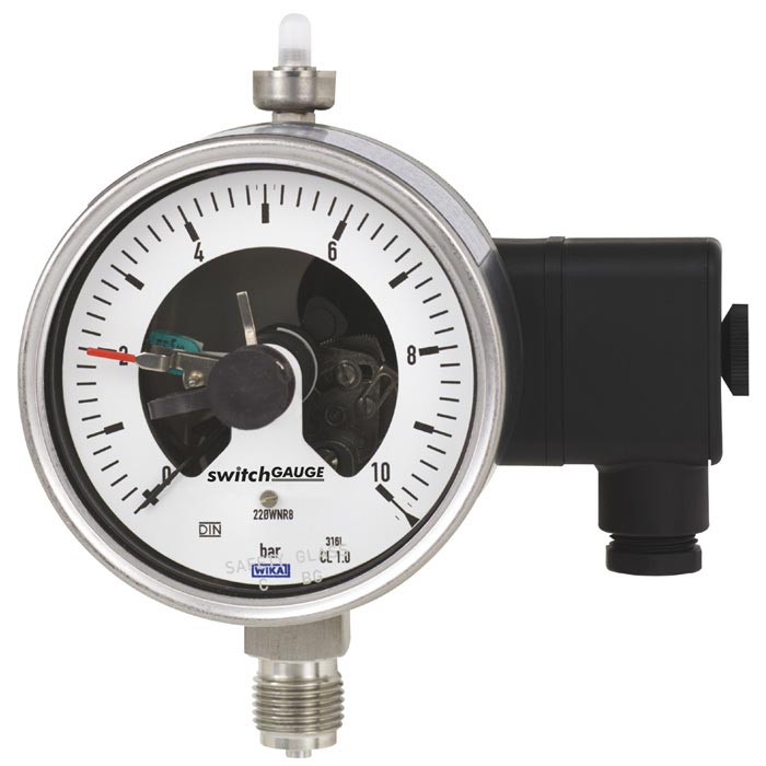 Wherever the process pressure is indicated locally and at the same time, the circuits also need to be changed, the PGS23.1×0 switchGAUGE model finds its application. Pressure indicators with contact (electrical switch contact) open or close an electrical control circuit that depends on the position of the pointer of the measuring device. The switch contacts are adjustable over the entire scale range (see DIN 16085), and are mostly located below the scale, although in some cases they are also above the scale. The instrument indicator (actual value indicator) moves freely over the entire scale range, independent of the setting.